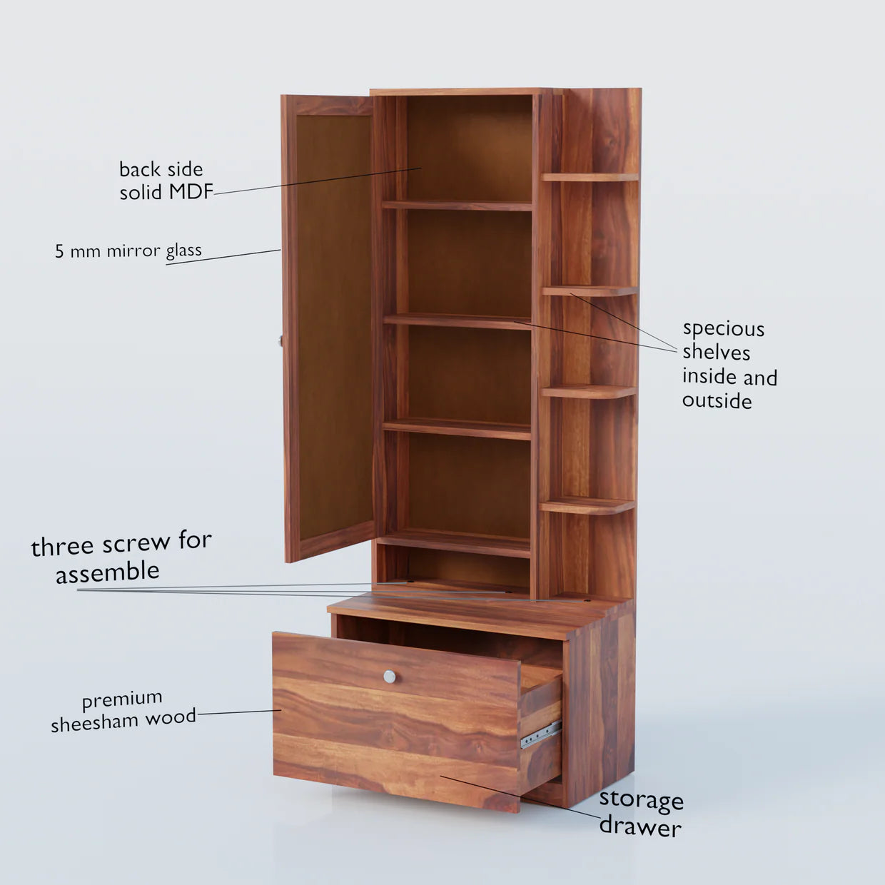 The Flexir Dressing Table is a smart and space-efficient solution designed for modern bedrooms. Crafted from premium solid Sheesham wood, it features a full-length mirror, spacious drawer storage, and multiple open shelves for organized access to cosmetics, grooming essentials, and accessories. The sturdy construction, elegant wood grain, and practical design make it a perfect blend of functionality and style for everyday use.
