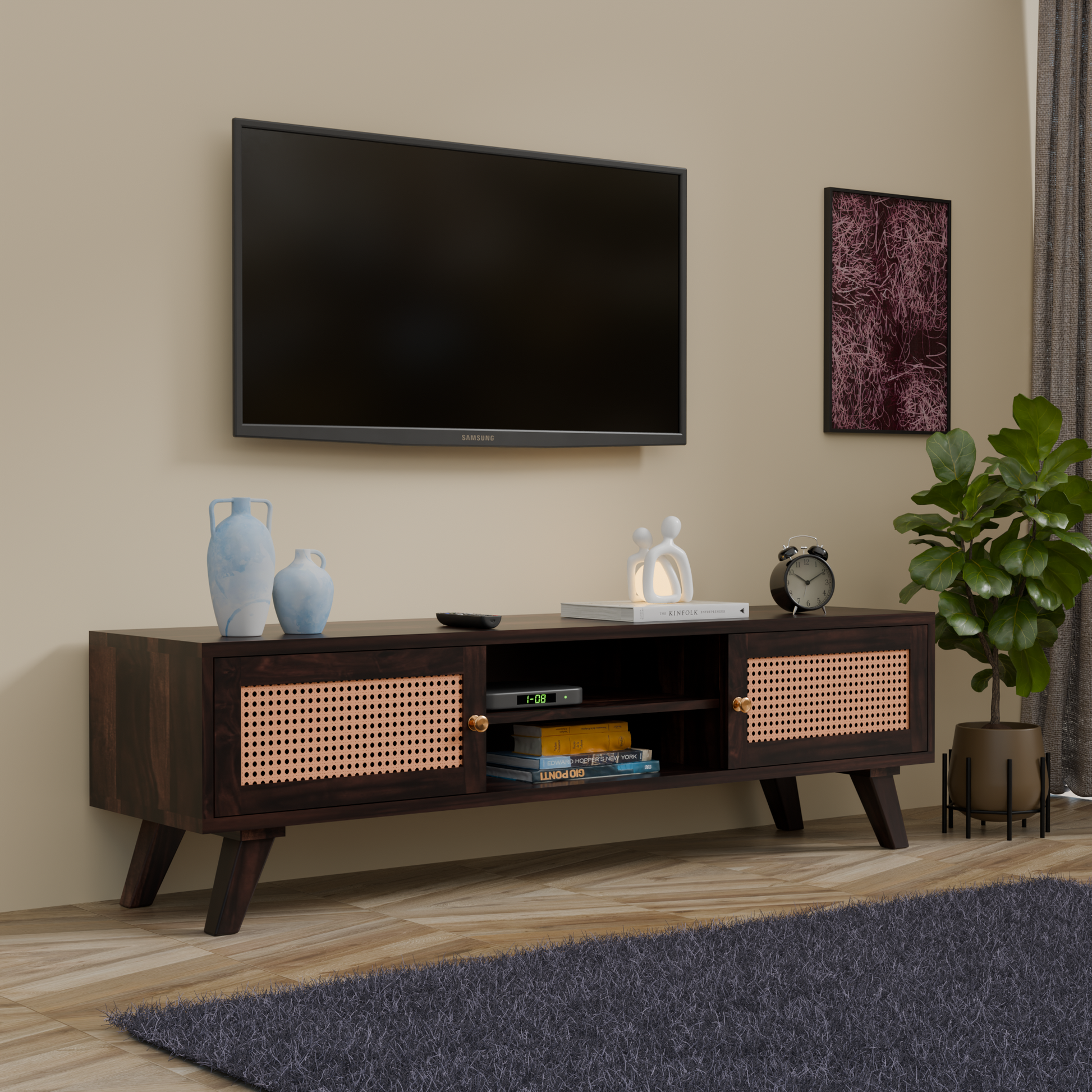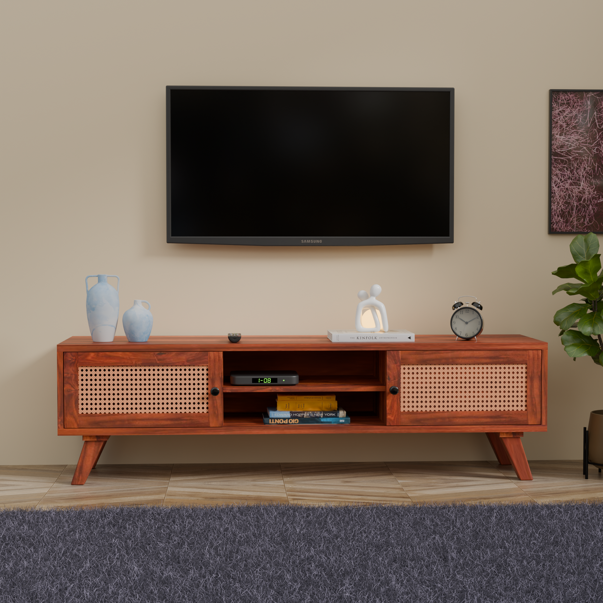 Design: Modern wooden TV unit featuring elegant cane (jali) panel doors on both sides and open central shelf. The design includes tapered wooden legs for a mid-century modern look. Compact yet spacious, it blends functionality with contemporary aesthetics, making it ideal for modern interiors.